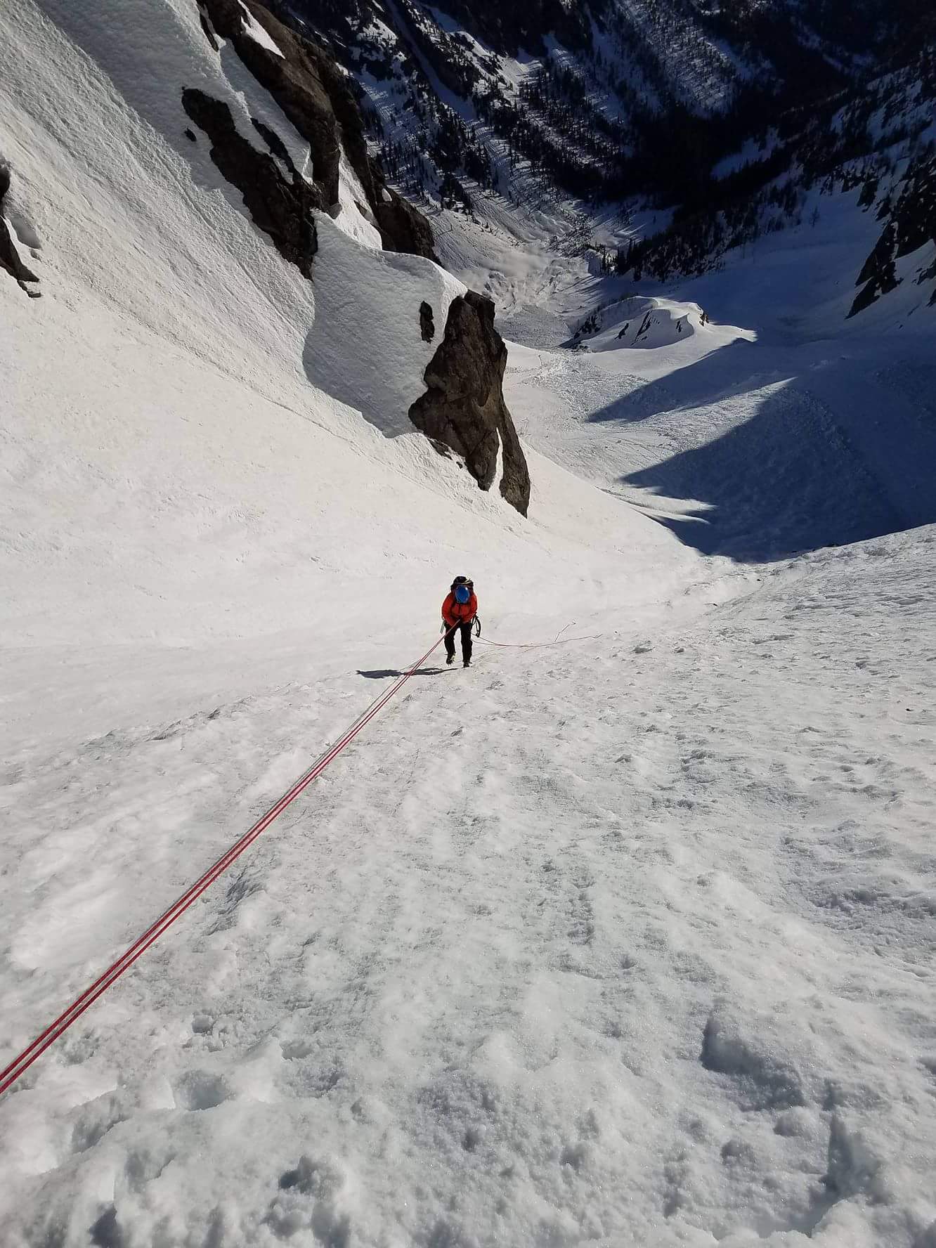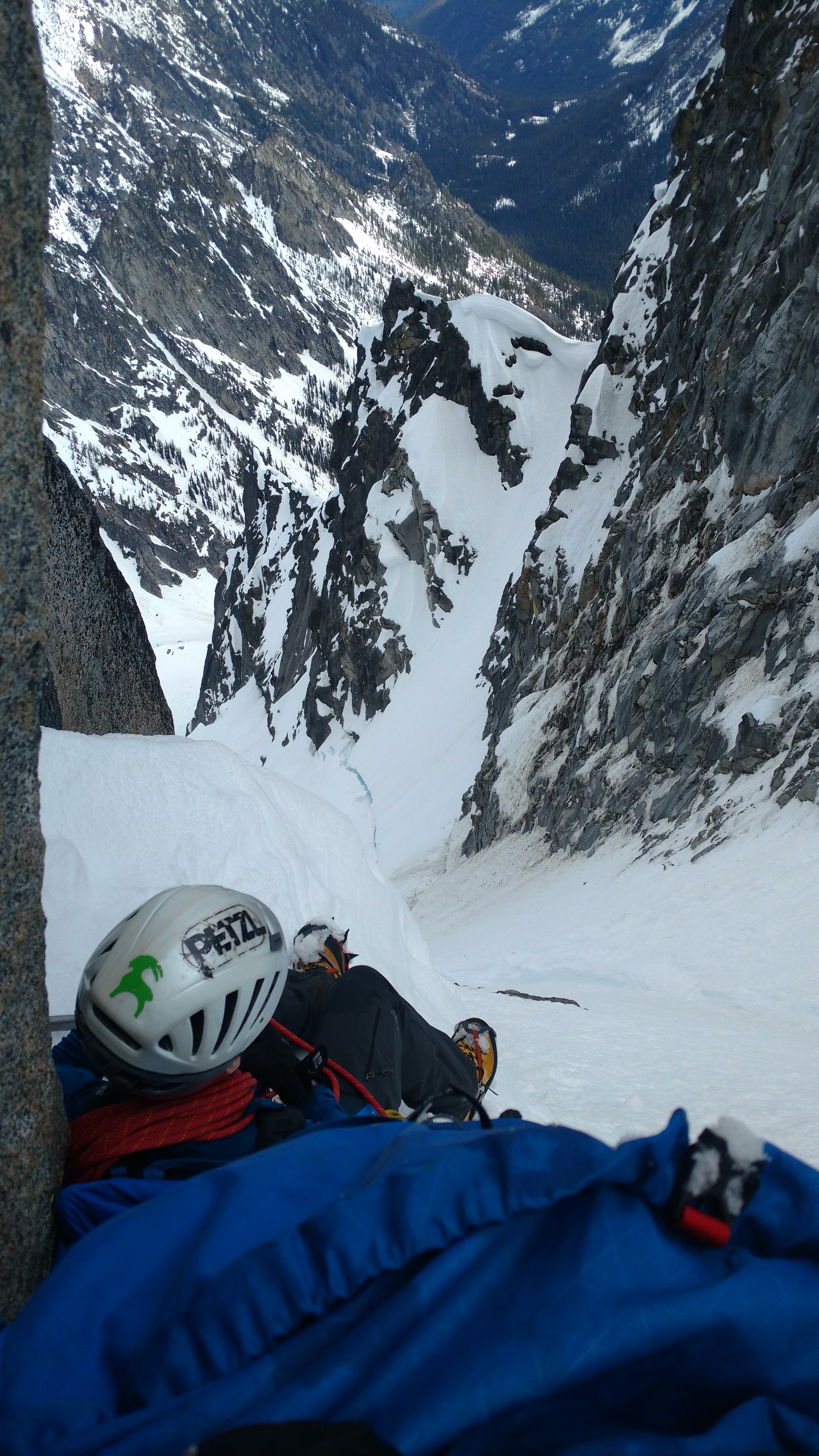 I heard the scraping of crampons on rock as Calvin dropped onto the rappel. He came over the lip of the rock face and saw the moat and released another stream of curses. I held the ends of the rope so he’d come straight to the snow shelf, and handed him my ice axe (should have brought a tool…) and pointed out the 7 or so ft he’d be leading. There’s my screw, you got a picket, we’re almost out of here. Calvin snapped into focus and was the happiest I had seen him in a few hours. Some people just enjoy being useful. He was up and over the lip in three swift moves and fewer than 12 f bombs (most of which were directed at my axe, because the pick wouldn’t stick to the frozen snow at all). He pounded in a picket, belayed me up, and we rapped as far down as we could off the picket since face-in-downclimbing steep snow is a pain in the ass and it was like midnight. I’m getting really good at leaving gear behind. Oh, we had rapped off a nut earlier too. Jesus.