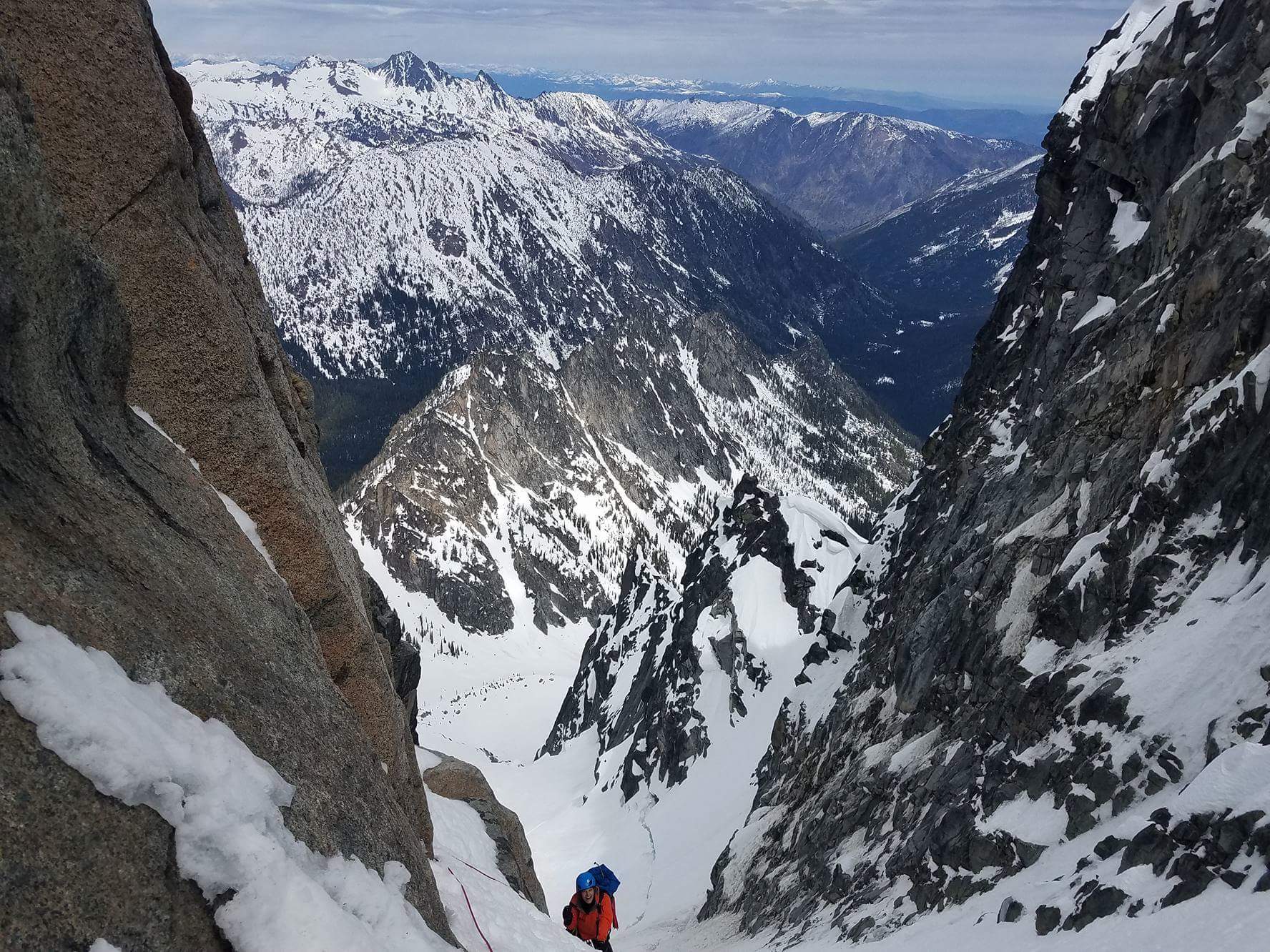 From the top of the crack that marks the start of the route, you basically follow a series of ledges to the left until you’re dropped into another nice, loose gully, this one whiter than the first one (I don’t know why that sticks in my memory). Head up and right to another dip in the ridge (rap slings were a good cue), and drop down onto the southeast face and follow more ledges to the saddle between the two summits. I honestly think we might have been following a different route than planned, because there was very little ridge involved, mostly face traversing. But it was quick and painless, so I didn’t  complain. I snapped a few pictures of the team behind us, excited about the views, forgetting how they’d consistently get better and better as we went.