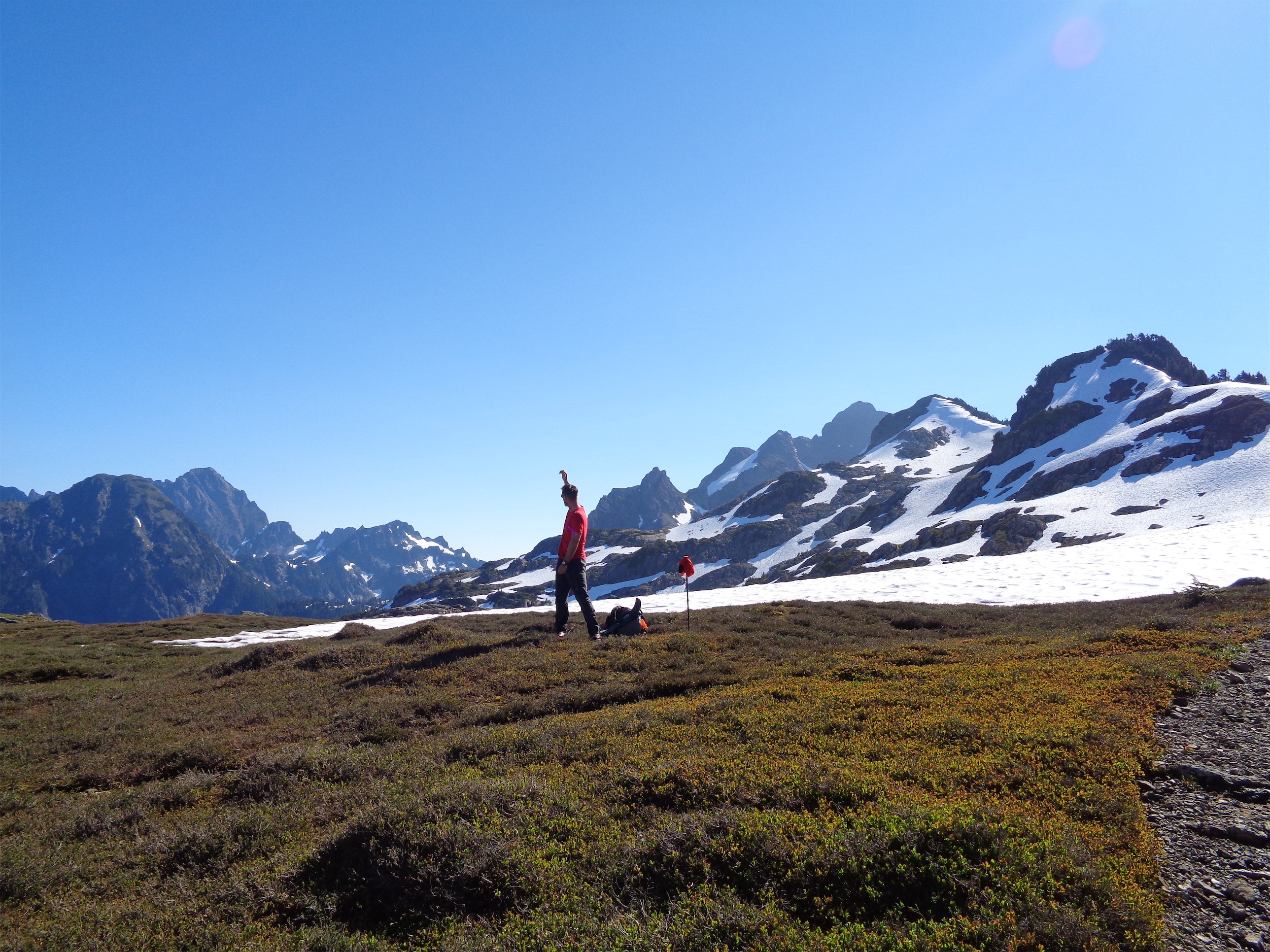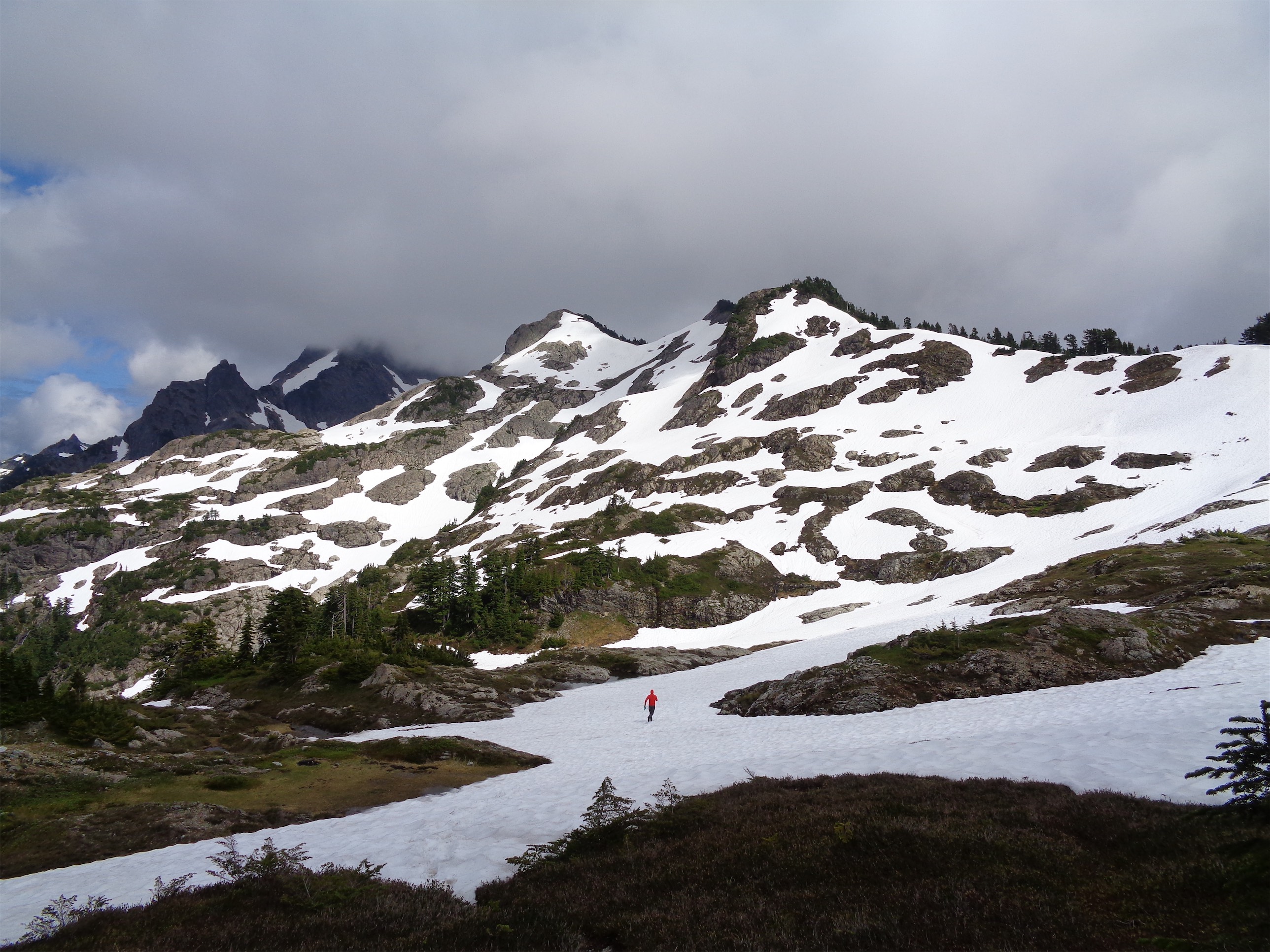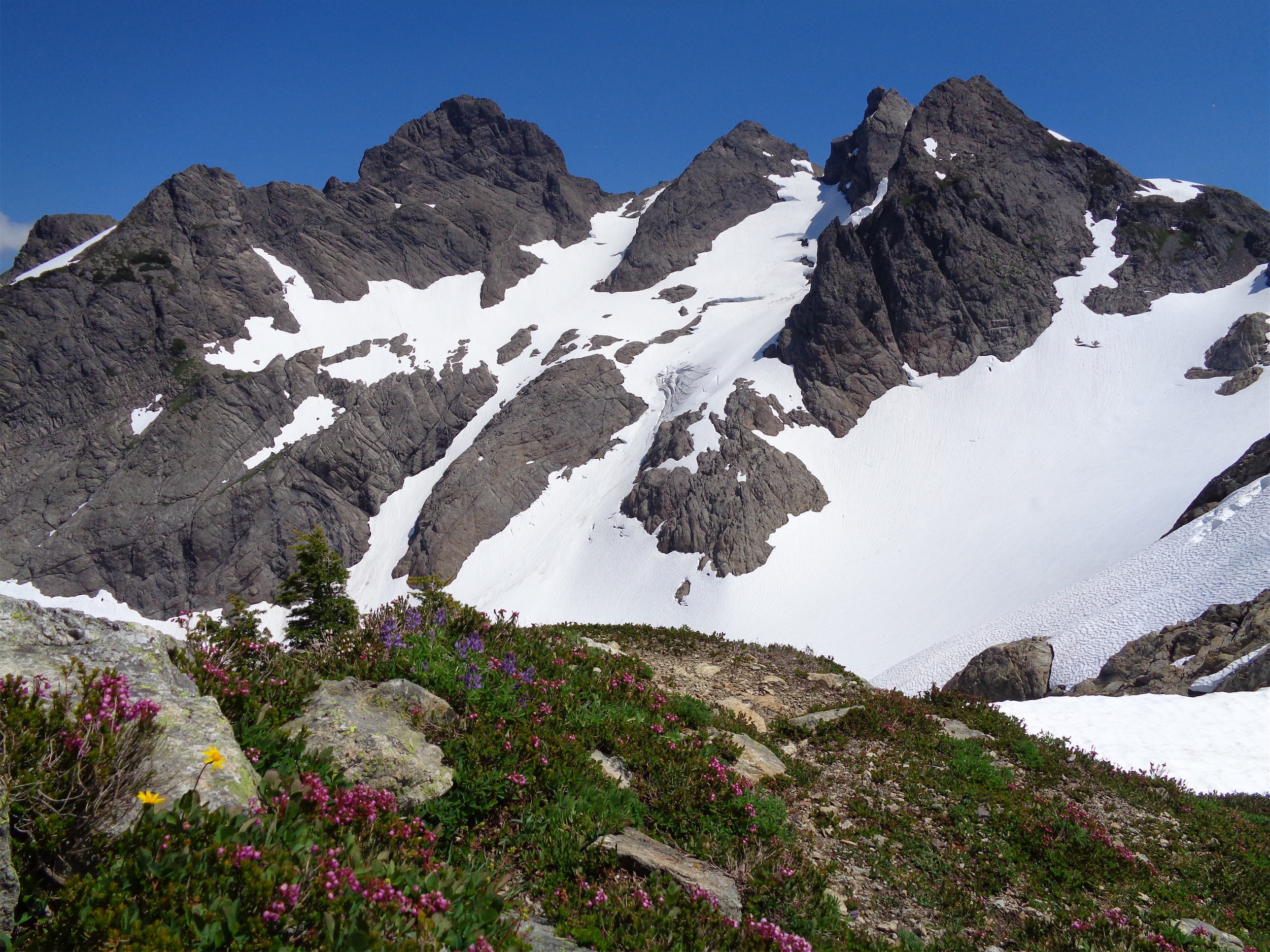 We broke above tree line (finally!) and my mood picked up a bit. Not enough to get the legs back up to speed, but at least we were drifting through meadows looking at Johannesburg and Mixup and Magic and Sahale and could see the entire traverse ahead of us, a ridge of rock poking out above quickly softening glaciers. And we found the Boston Basin toilet everyone talks about! Add it to the list of Classic Craps of Washington. I haven’t made much progress towards my future as the Patron Saint of Alpine Shits lately but this was a step. I snapped a picture and we continued on, across talus that eventually gave way to the slabby sort of rock that used to be covered by glacier.
