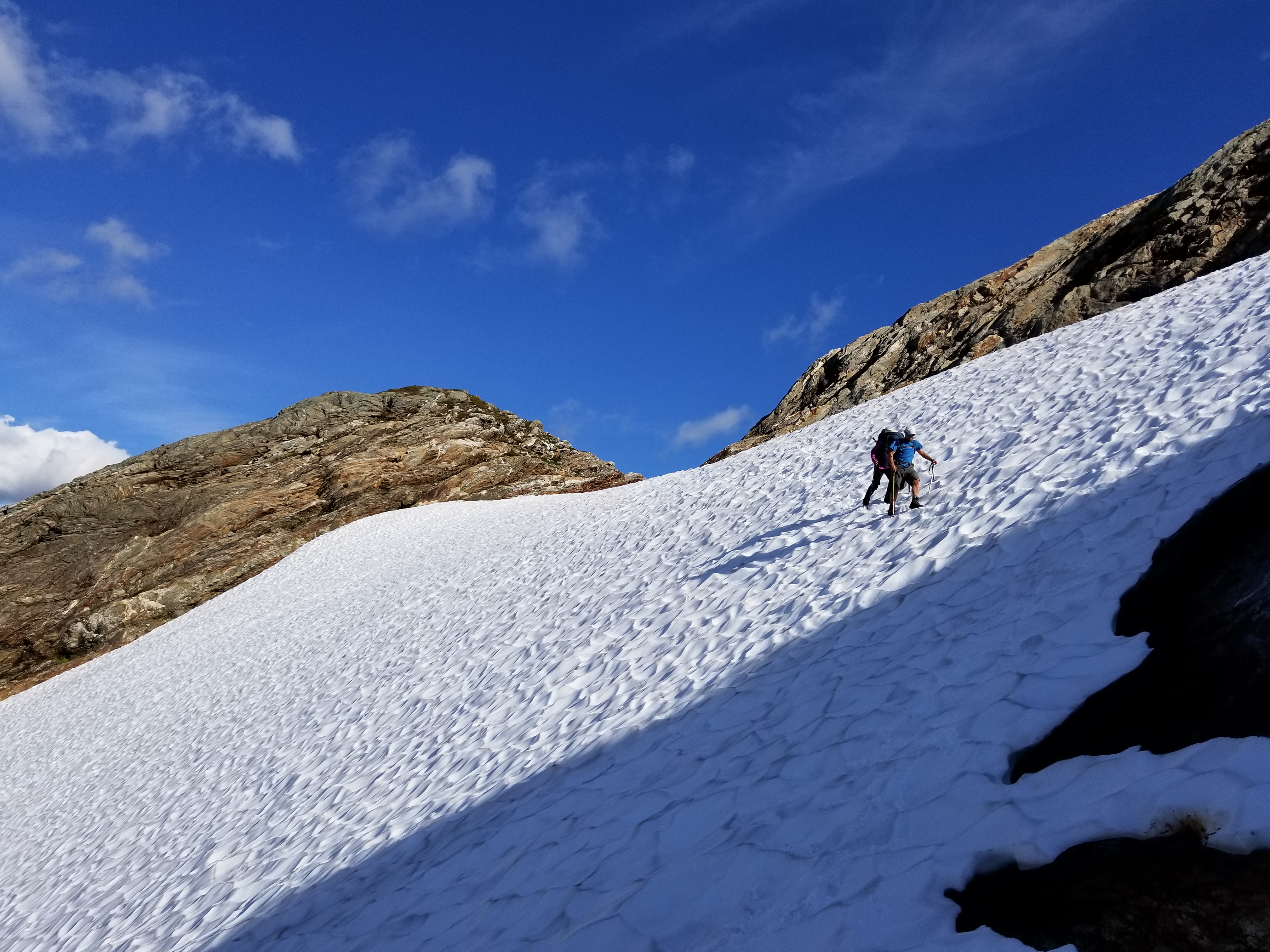We started down. I was anxious about downclimbing. I think it’s similar to my issue with slabby climbs, I just don’t trust my feet. I know logically it’s better to stand up straight, but when it’s exposed I try to keep my center of gravity low, which usually results in my shoes not getting full purchase on the rock. The more of it you do the easier it gets, but I hadn’t been doing a ton of rock climbing this summer. We rapped the crux and two other sections (rap slings are abundant) and it took us longer to get back to the notch than it took to get to the summit. We collected the gear we had stashed (socks finally dry! Woo!) and decided to rap the gulley (mostly my decision, I think) rather than down climb. Rapelling is tedious, but I was mentally done with downclimbing, and there was a group below us ready to be pelted with rocks if I knocked anything down. There are rap stations the entire way, and we ended up downclimbing a few steps at the bottom to reach the glacier. I had my last awkward moment here, knowing there were steps below my foot but not being able to see them with nothing to grab with my hands. If I have a handhold, I’m happy to hang off it. If I don’t, it’s hard to trust that my foot is going to land on something. This is me downclimbing. I’m uncoordinated, what if my foot is an inch too far to the left? I laughed at myself again, rolling my eyes at the stupidity of the situation. “You have like three huge stairs right below your foot!” I heard Connor yell. Suck it up, buttercup.