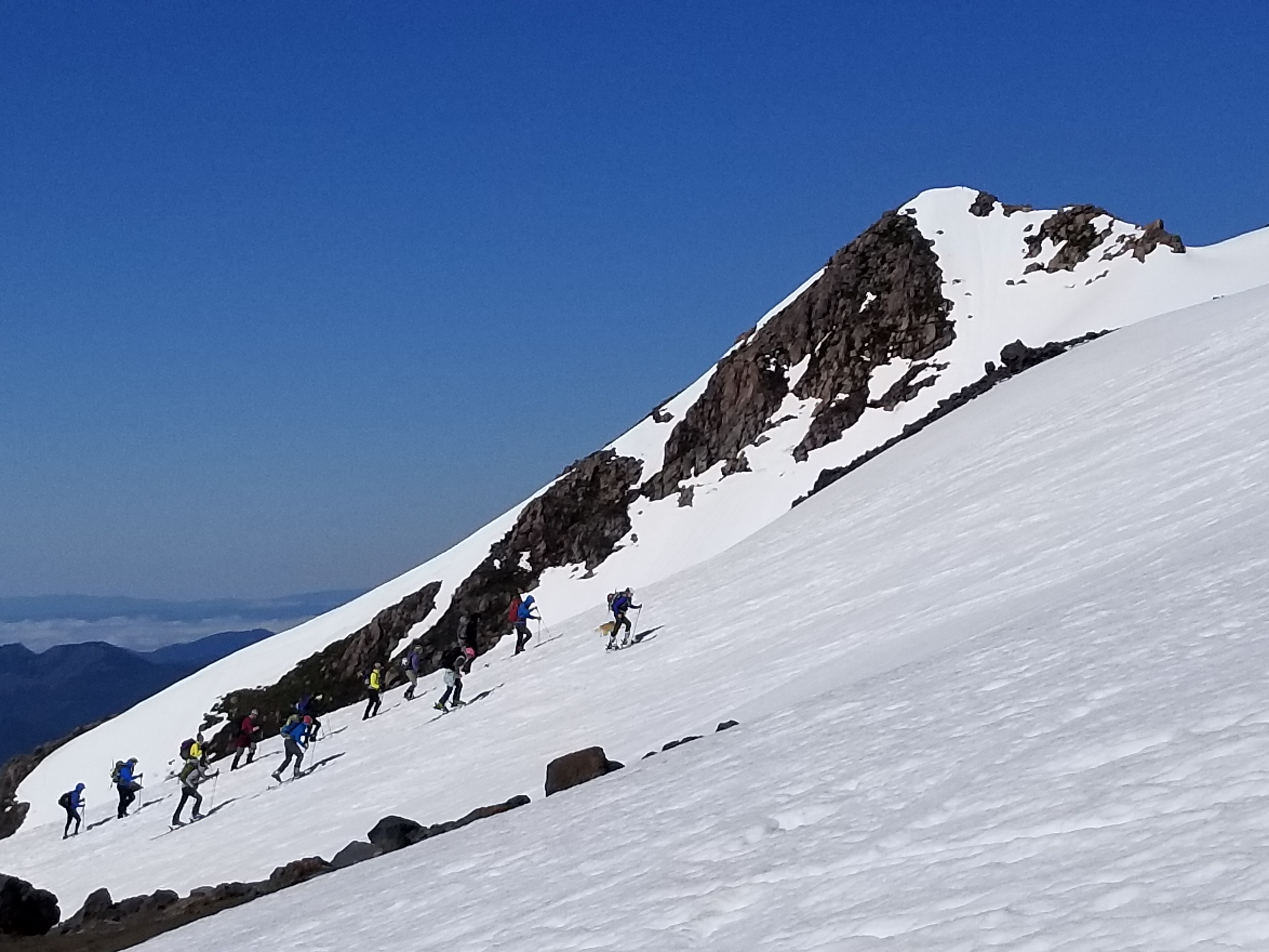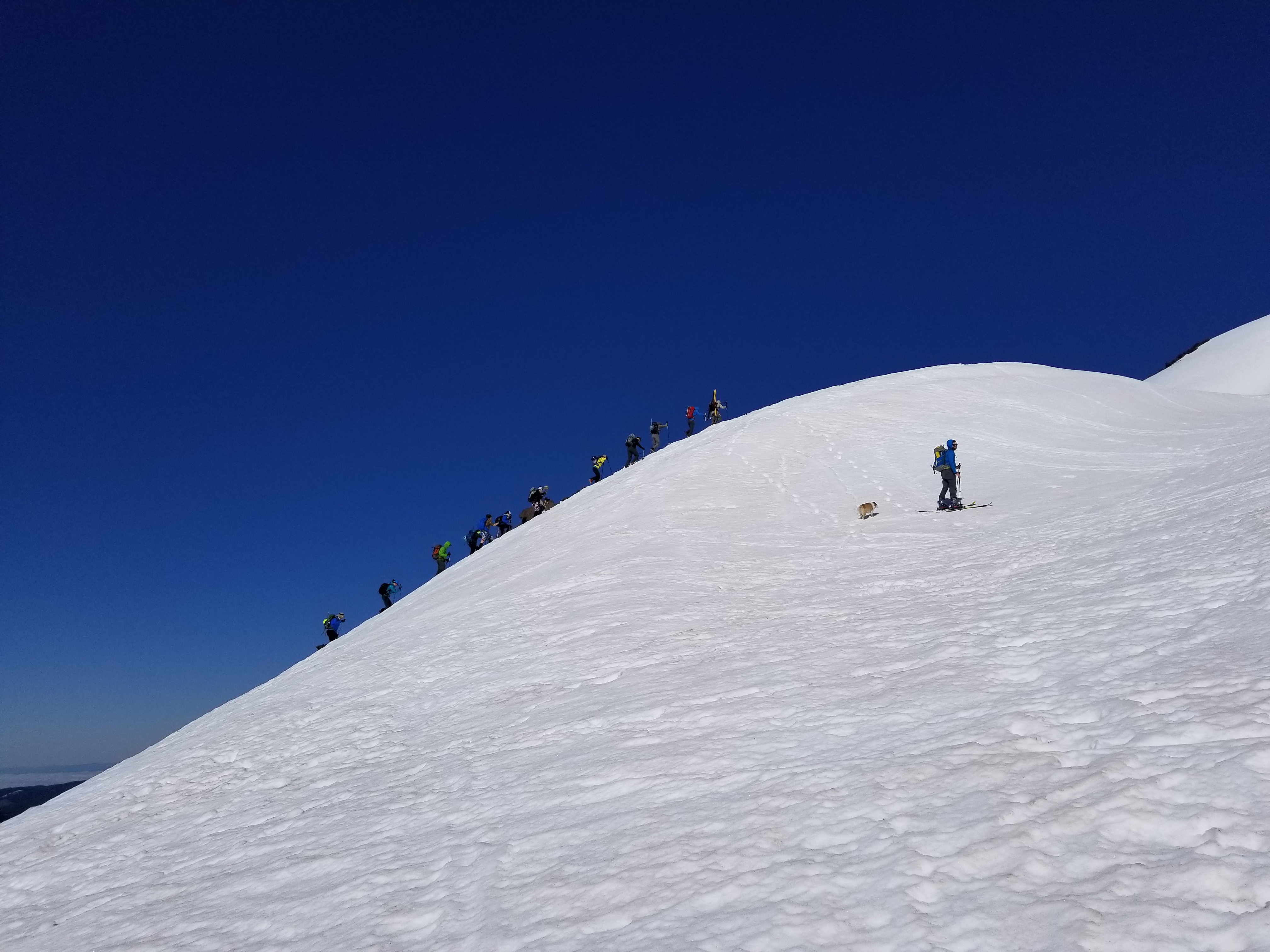 We cramponed up and crossed some mellow blue ice before the glacier steepened, and eventually were frenching up past a 20′ deep leg-breaker of a crevasse. The sides were solid, no caverns to deal with, just a 6ft wide gash across the glacier and we were lucky enough to find a snowbridge in the center. There were two smaller crevasses near the edges of the glacier that were easily avoided, but we had to do some zigzagging and hope for the best. Overall, it was very well snow covered with fairly obvious features, no concerns for the next few weeks. As long as you can remember how to walk you’ll be fine. It’ll probably get icy later in the season but we didn’t see any signs of anything more gnarly.