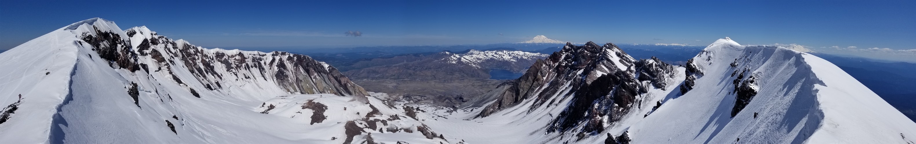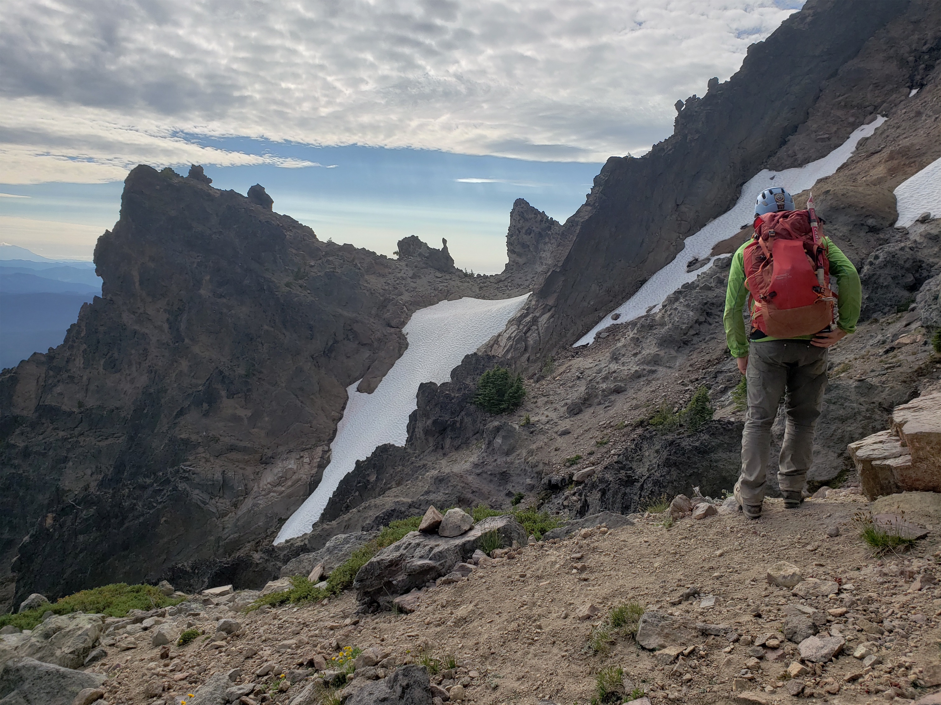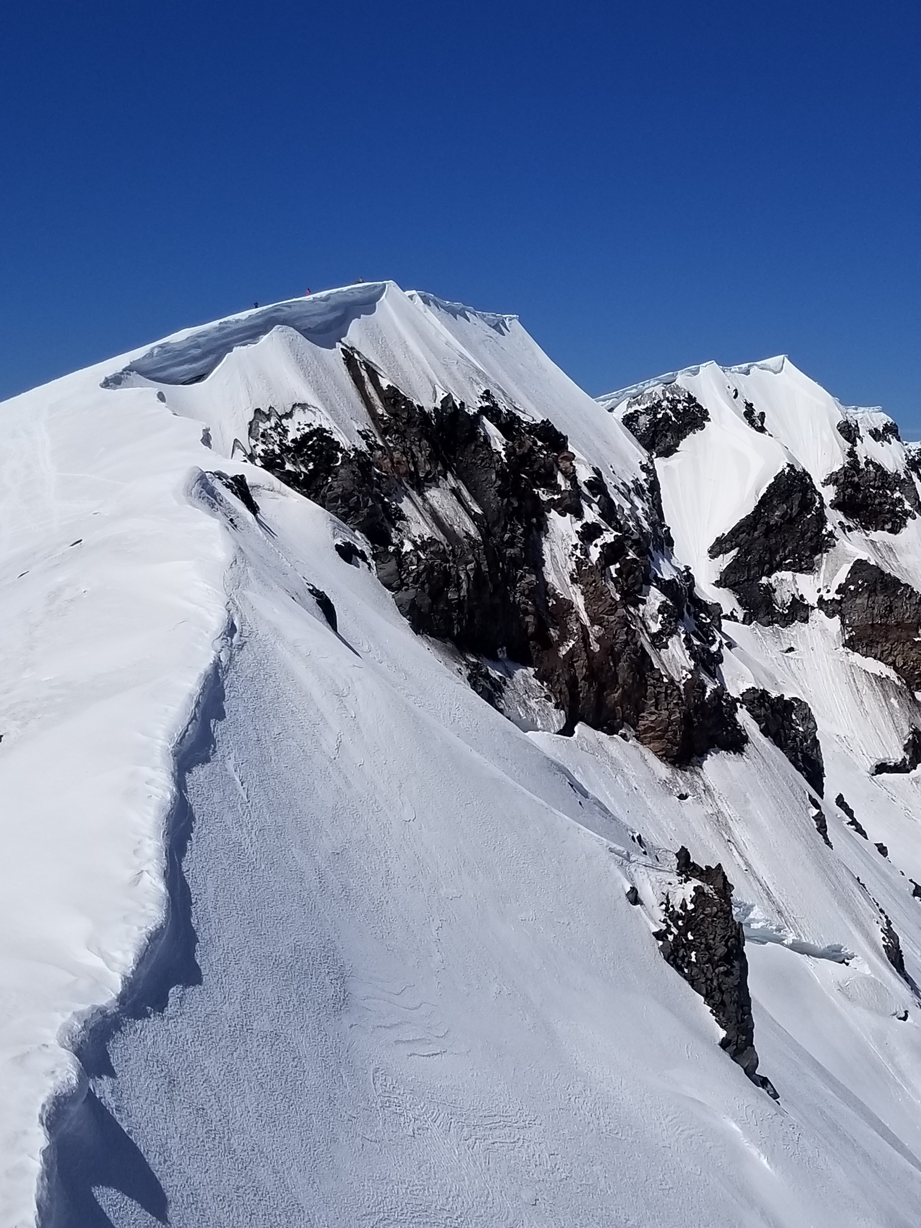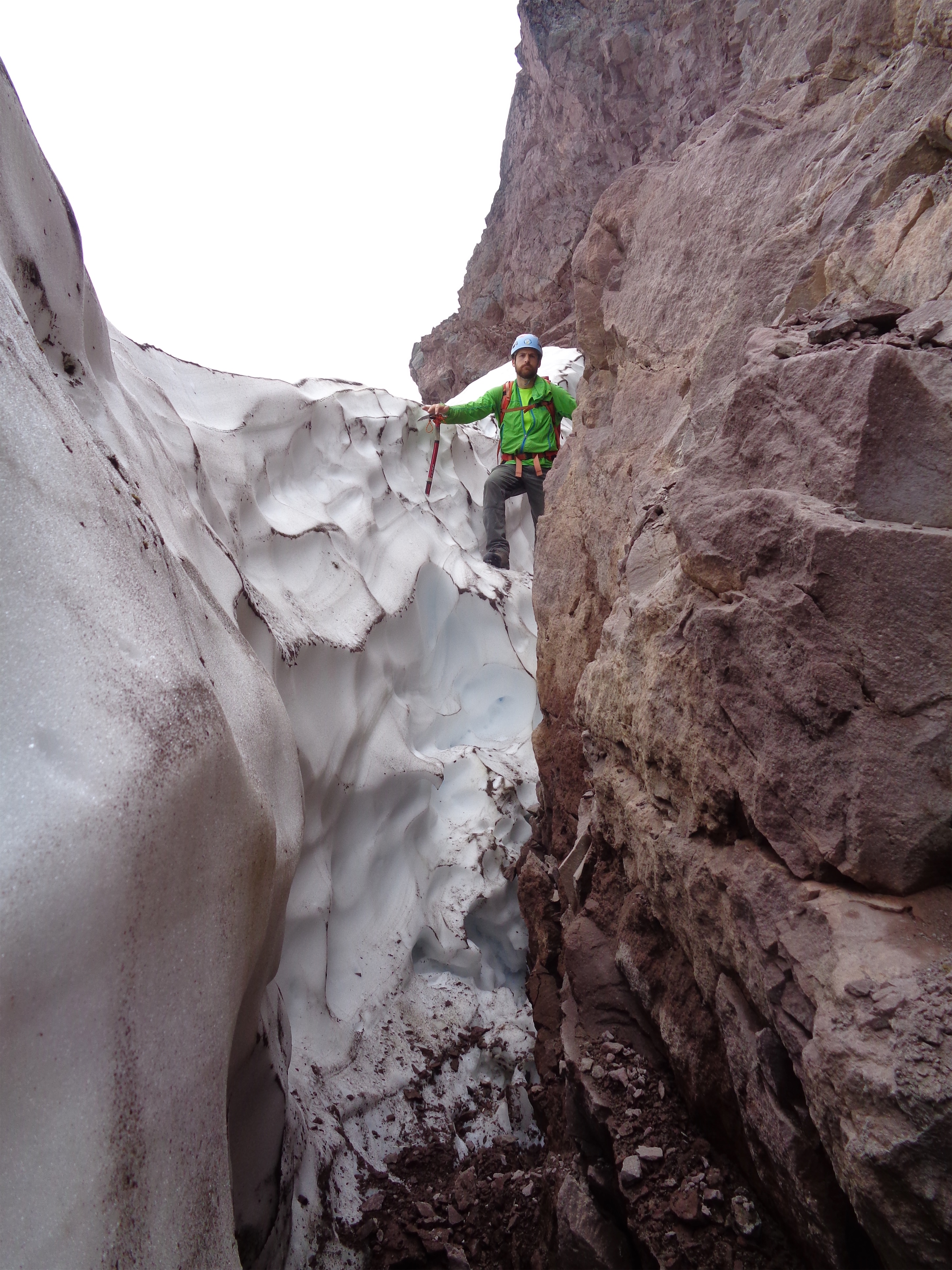 Anyway, had I read the beta thoroughly, I would have known that dropping onto the southwest side of the slope would have been an easy talus walk instead of 3rd-4th class scrambling. I prefer to stem between rocks and ice over exposed 4th class, so I squeezed my body into the bottom of the moat (which to be fair was also a 4th class downclimb to get into, so… I didn’t really win here) and stemmed out a few feet later. Robert scrambled above the moat just our of the picture frame and vertical-limit-ed his way onto the snow at the end of the scramble. Trust. Nothing. Assume every foothold and handhold will come loose. Assume all ledges are covered in kitty litter. Assume the mountain will dump rocks on you. Wear your damn helmets. We scrambled up another disgustingly loose col one at a time to gain the ridge again where I read the beta again and saw the line about going south to avoid moat/glacier entirely. Oops.