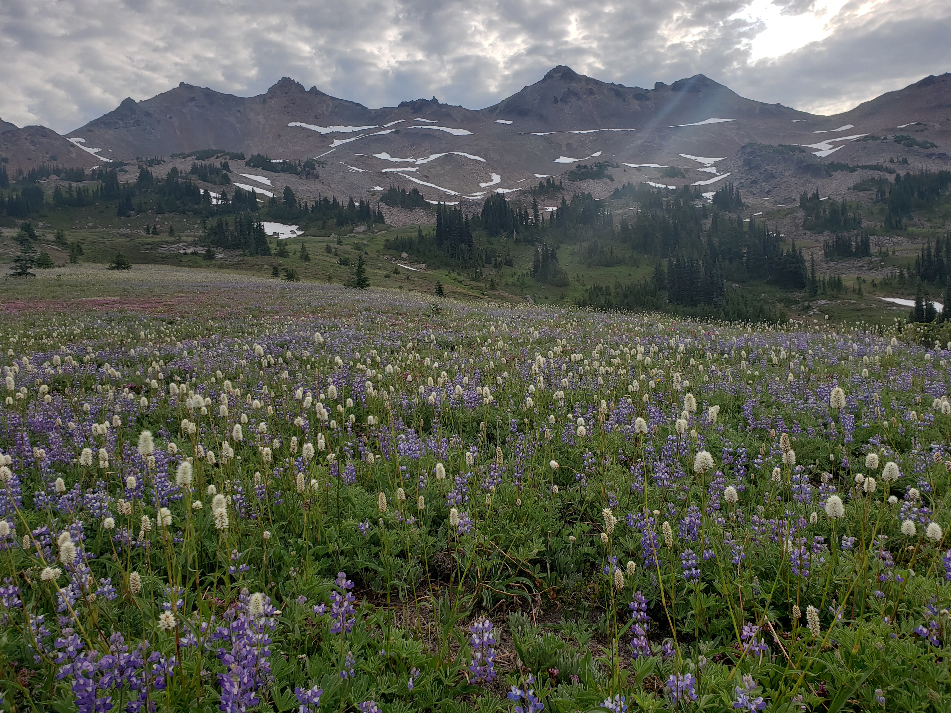 Waking up Sunday we started heading down Cispus Basin, dodging wildflowers and streams as we went. The sun hitting the wildflowers was insane. We had clouds all day Saturday, and the wildflowers were beautiful enough then, but lit up by the sun made them even more vibrant. Did I mention I underestimated the beauty of Goat Rocks? We took an extra ~1 mile detour to make sure we had drank in all the wildflowers we could possibly fit. It’s the same feeling when you have a drink and you’re wicked thirsty, except with your eyes. Suddenly the world looks oversaturated and ridiculous and yet it’s real!