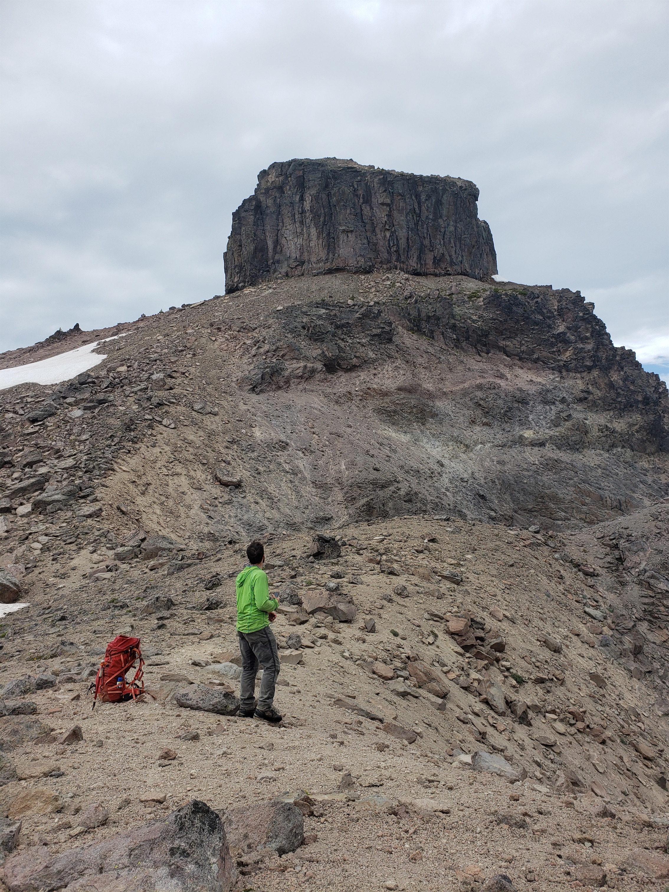 From there, it was a talus walk rising gently to the right to get to the base of the summit. We passed a cool window in the rock just below us, and pulled some 3rd class ish traversey moves just above that to contour above more nasty scree. Back to less nasty scree walking for a little longer, and finally straight up some weaknesses that were surprisingly solid and a combo boot path/a few more scramble moves to the summit. Far less scrambling than I had expected, honestly. The views over Conrad Lake were phenomenal, it looks like a very cool basin and the ridge next to it looked like a lite version of painted hills in Peru. And finally, a summit register!! Several parties had beaten us up Gilbert from the east route, which I hear is much more pleasant (but still gets the neat scramble at the end). We snapped pictures, had a snack, and headed back to the col, mildly anxious about the way down from Gilbert. We hadn’t heard anything positive about it.