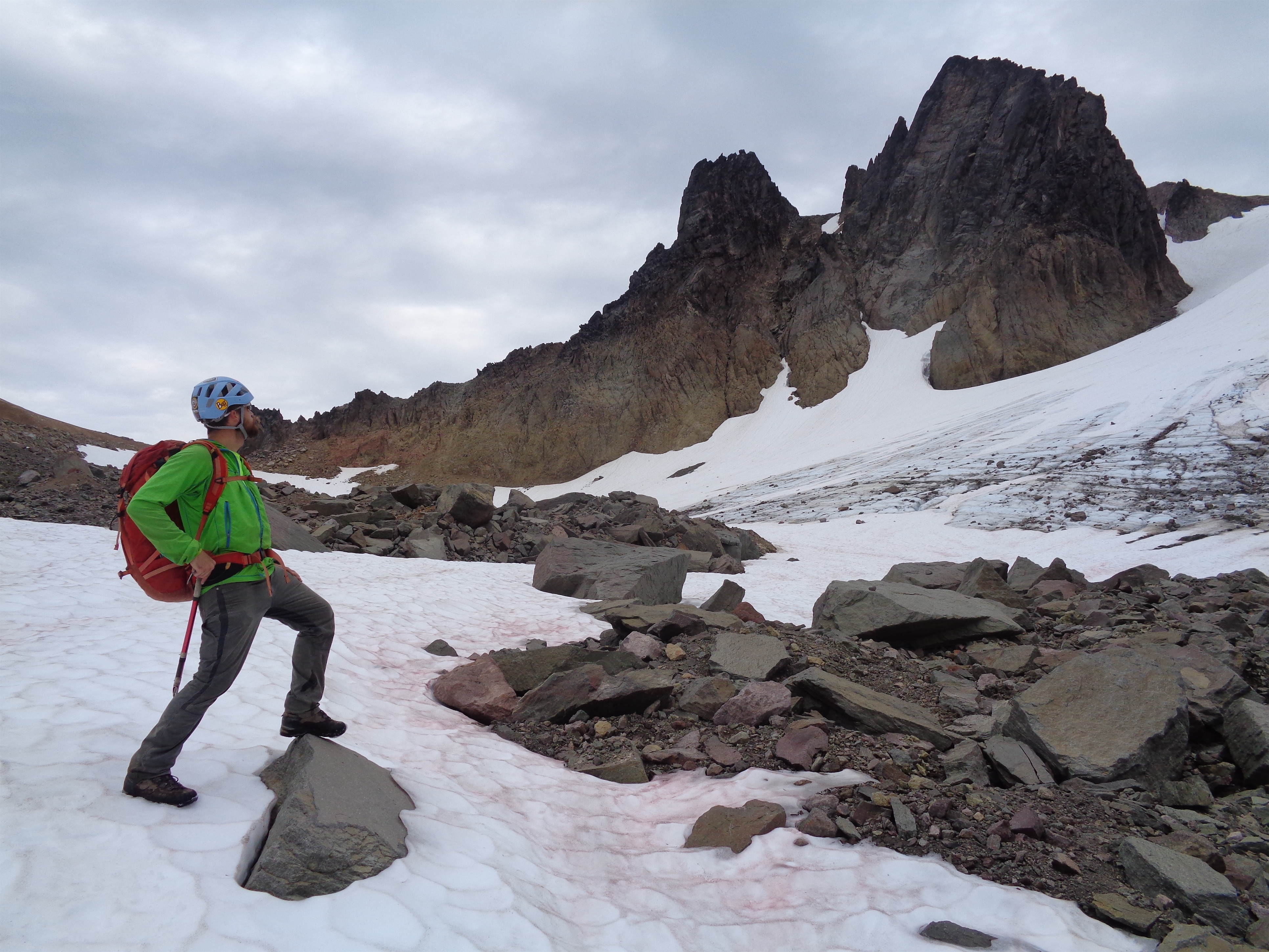 From there, it’s a quick walk up more loose scree to the summit. We dropped down to the next col, where we ran into the loveliest couple. We chatted with them for a bit about our route and their plans, and thought they corroborated the horror stories we had heard of the west route up Gilbert, we parted ways feeling wholesome and confident. Which is good, be cause we then lost even more elevation going down to the snowfields and glaciers on the northeast side to traverse below some cliff bands.