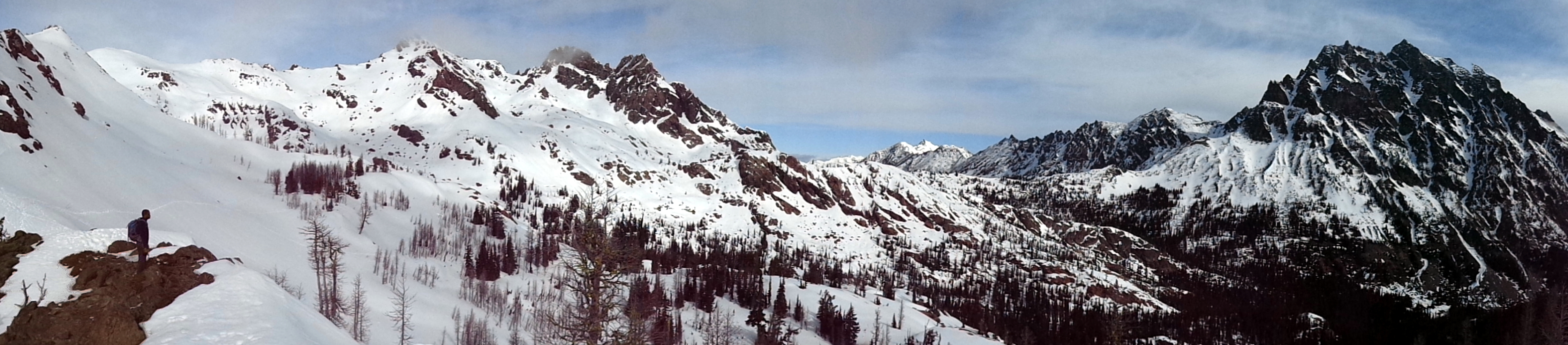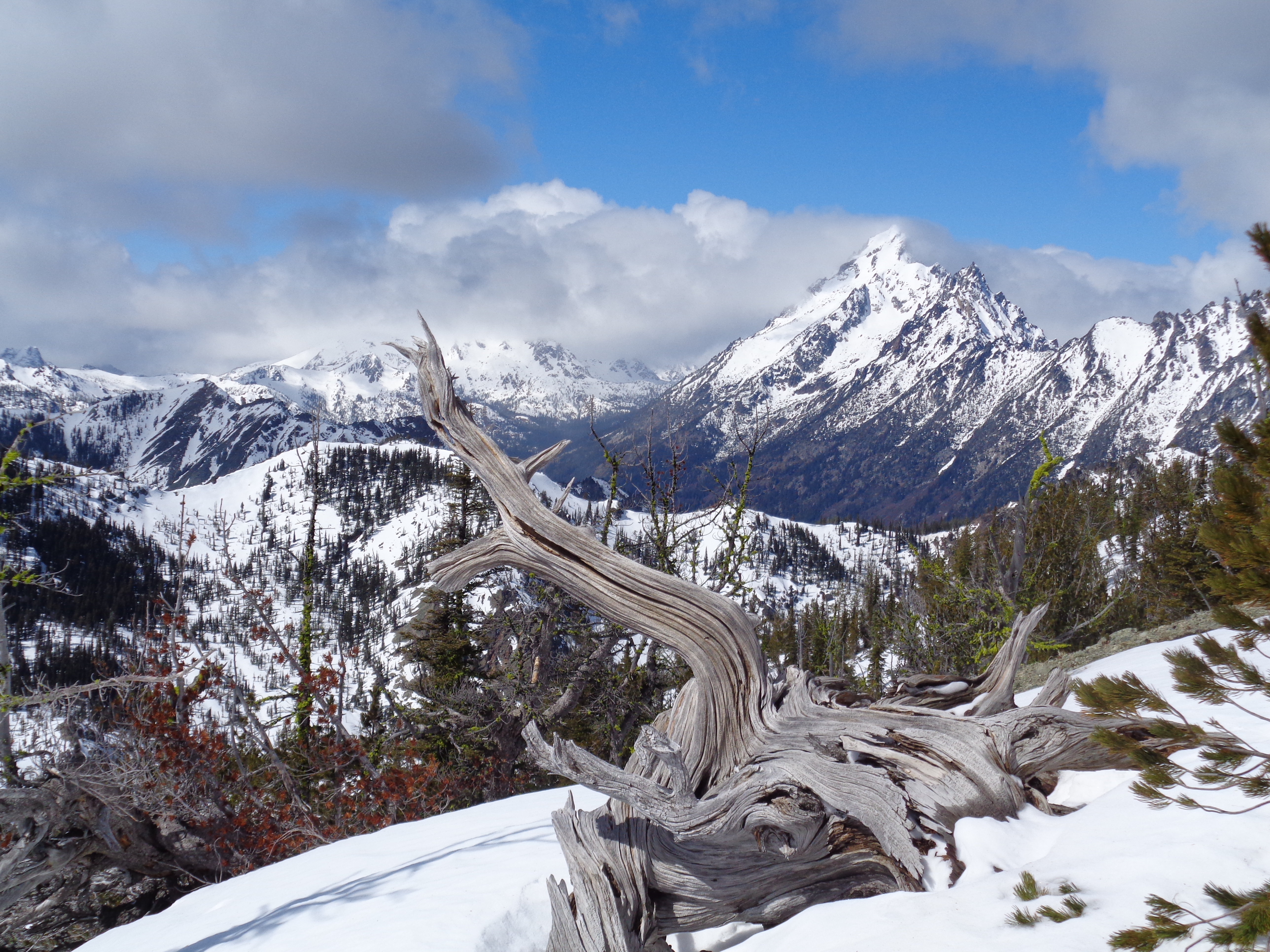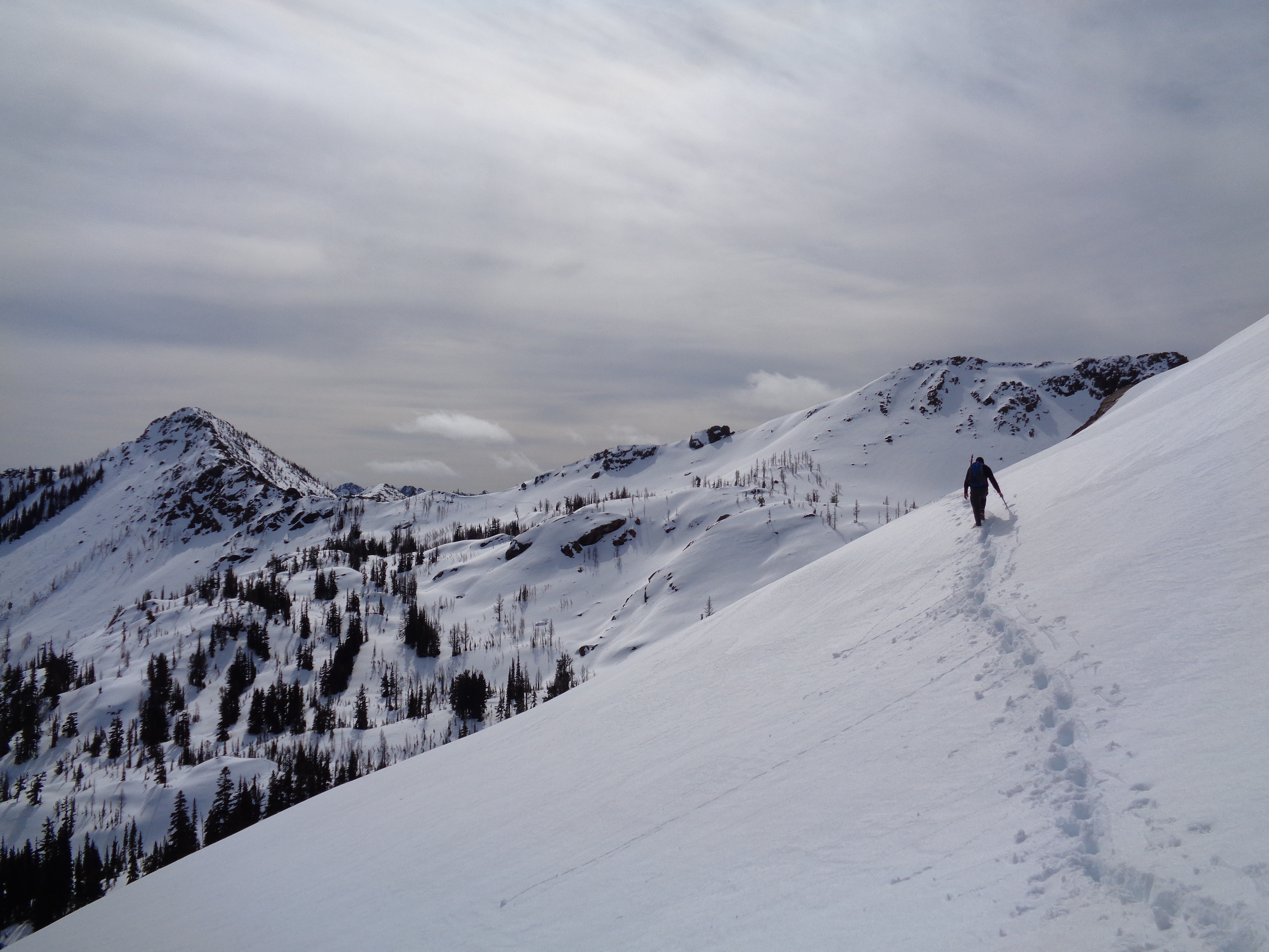 When we broke out above the trees, we swapped trekking poles for ice axes and aimed directly for the saddle. The snow wasn’t too deep, and it was compact enough that we didn’t have many postholing issues (a relief compared to what I slogged through back at Squire Creek Pass). We followed snow halfway up the slope, and switched over to some loose dirt for the rest of the way. Gaining the ridge, you have Gene’s Peak just a scramble away to your left, Iron Peak a ridge-walk to the right, and Bill’s Peak smack in front of you with the Stuart range behind it.