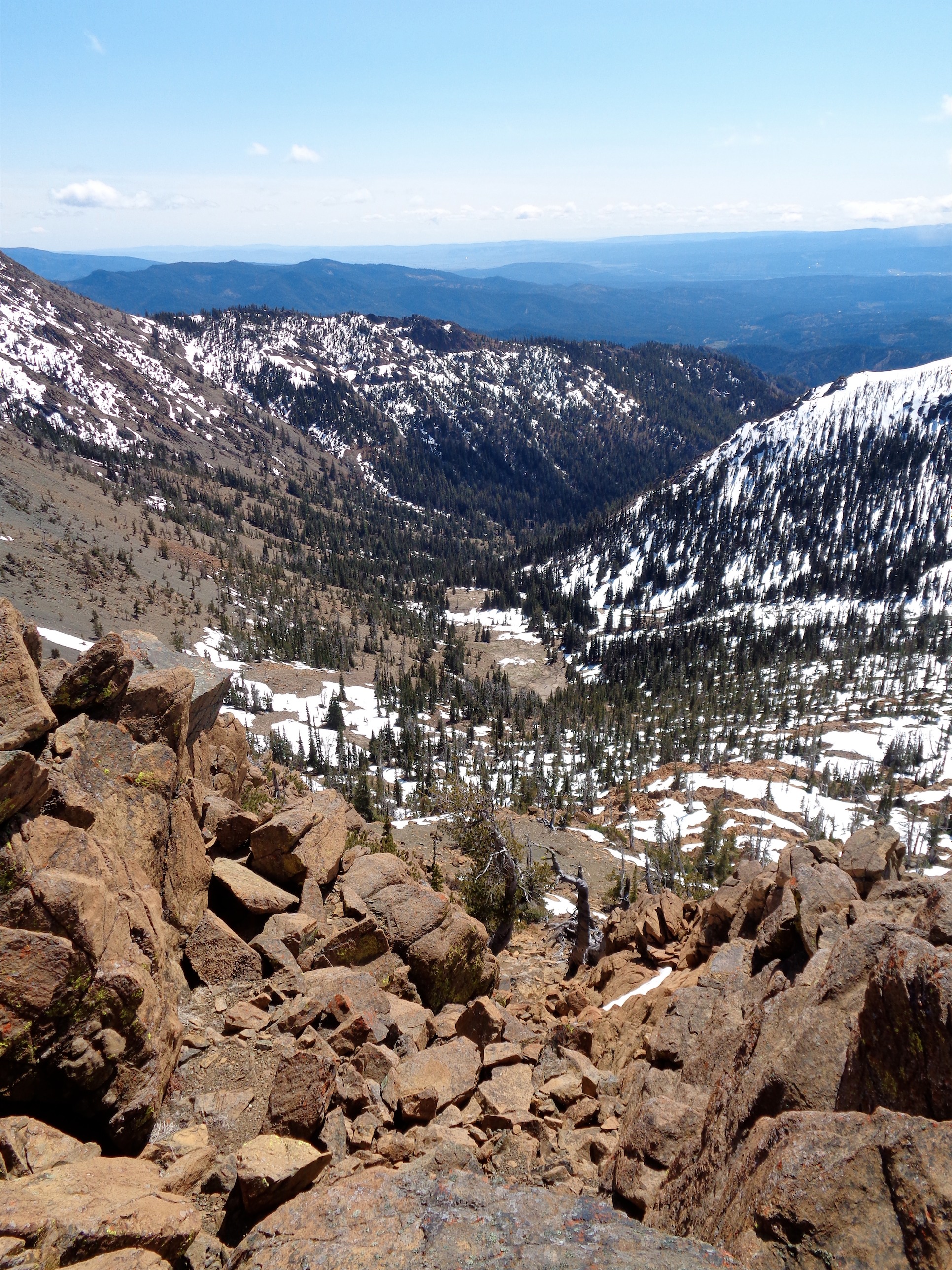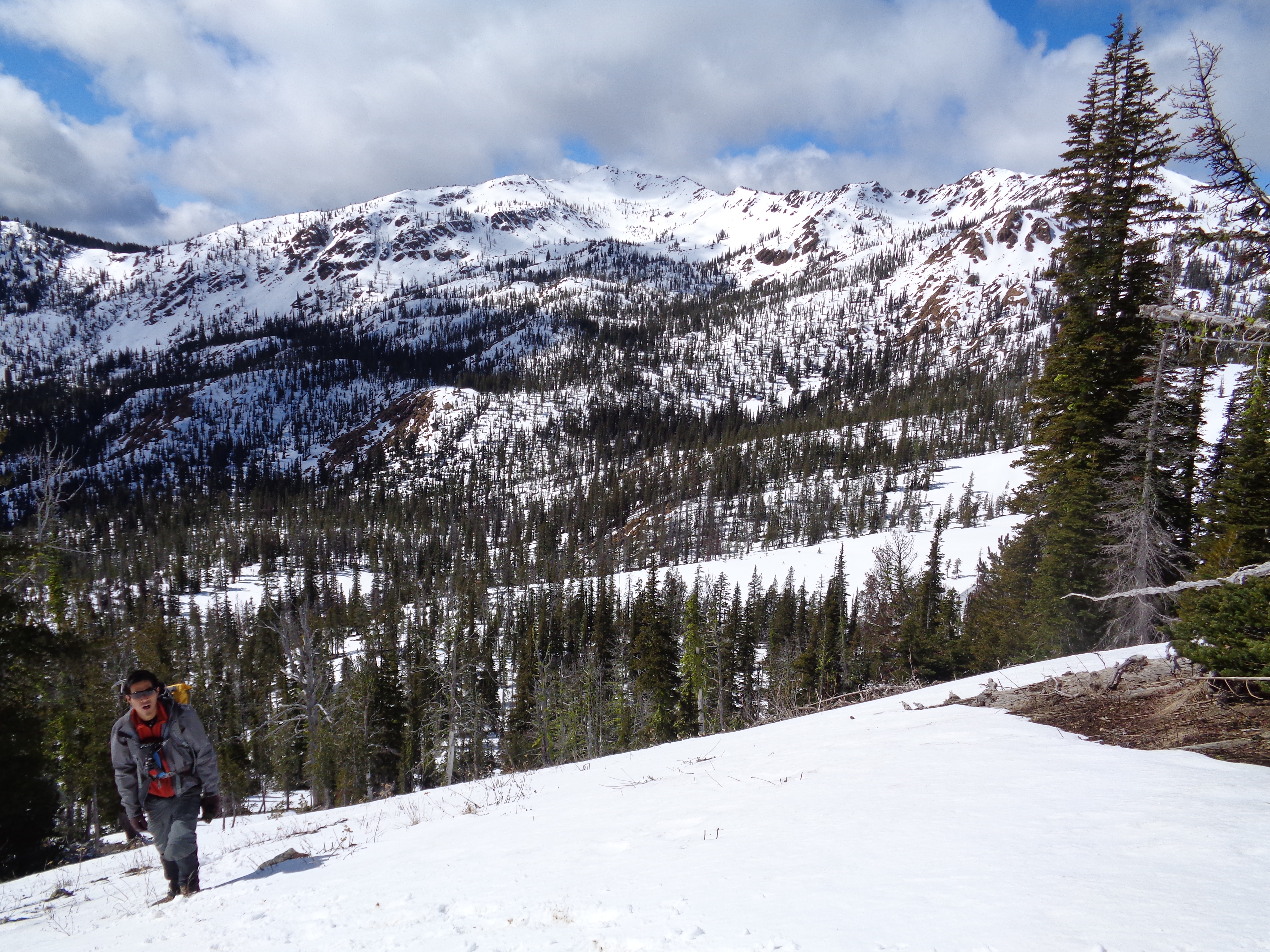 It was pretty windy at the saddle, so after more snacks Kayla and I headed back down to the tree line to wait for Kyle and Brian somewhere warmer. Plunge-stepping through the loose dirt (we skipped the steep snow) was much easier on the way down, and we sat on an outcropping of rocks to wait for the other. For what felt like an eternity. We heard a shout at one point, but couldn’t see either of them. How long should we give them before climbing back up to the saddle on a rescue mission? 10 minutes? Nah, they’d yell again if it was that big of a deal. Right?