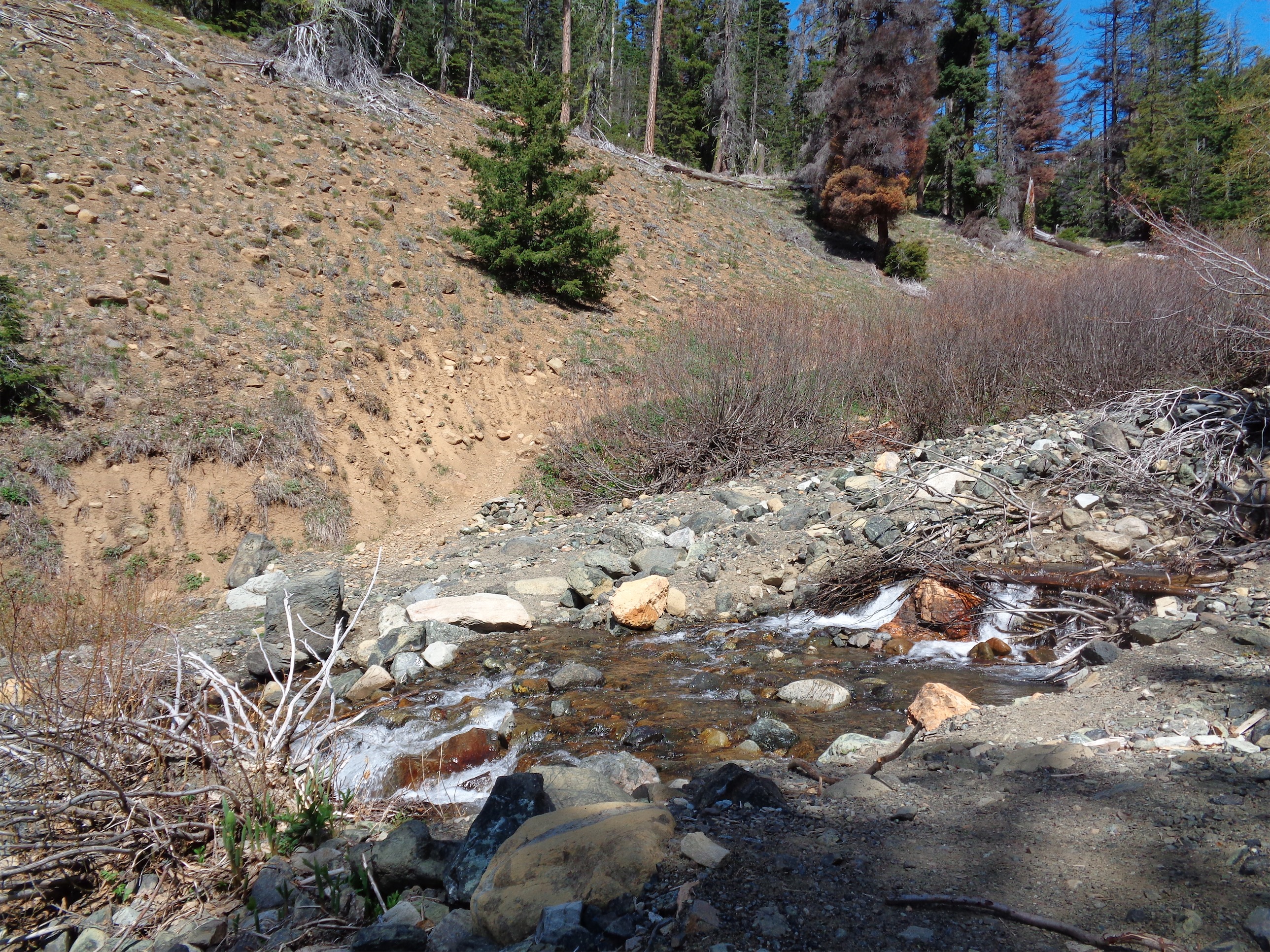 Everyone wore light mountaineering boots, and I tagged along in my barely-even-qualify-as-trekking-boots. They had never failed me before, and I hoped if it actually got tricky, I’d just go last and by the time I got there, they’d all have kicked nice solid steps for me. The trail switchbacks up along the side of the valley above Eldorado Creek, and was snow-free for the first mile or so.